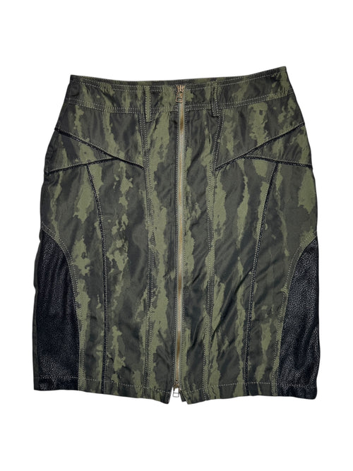 Vintage 2000s Subversive High Waisted Abstract Green Camo Print Knee Length Fitted Midi Skirt with Double Zip | 28 Inch Waist