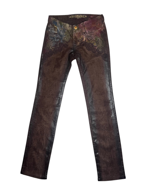 Vintage 2000s Y2K Low Rise Brown & Multicoloured Abstract Velour Pants with Liquid Metallic Detail | 28 Inch Waist
