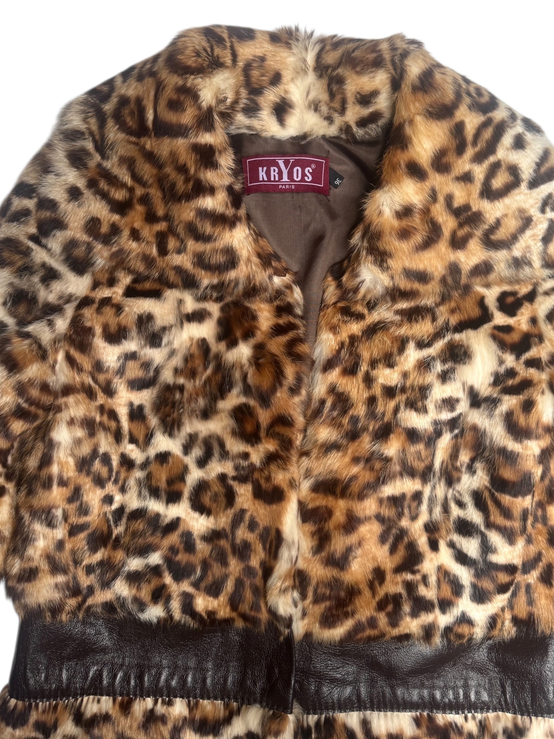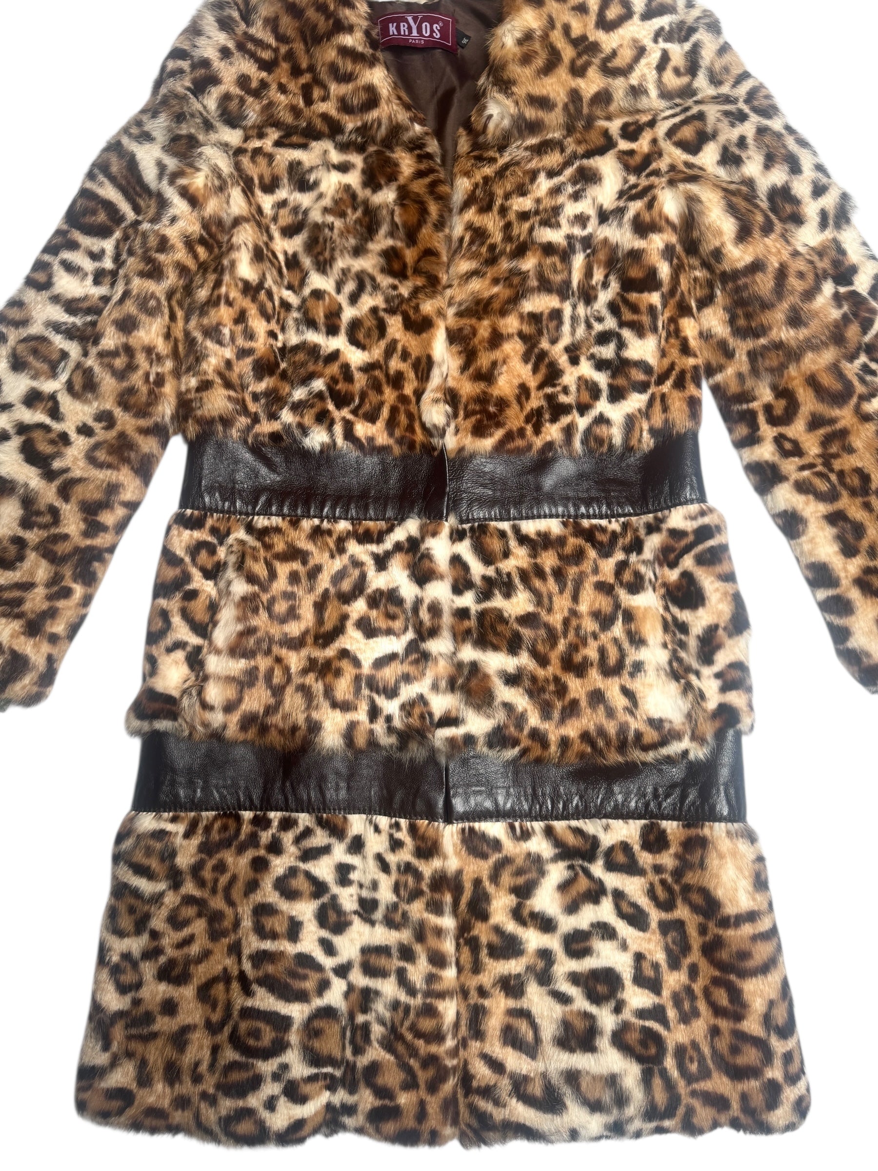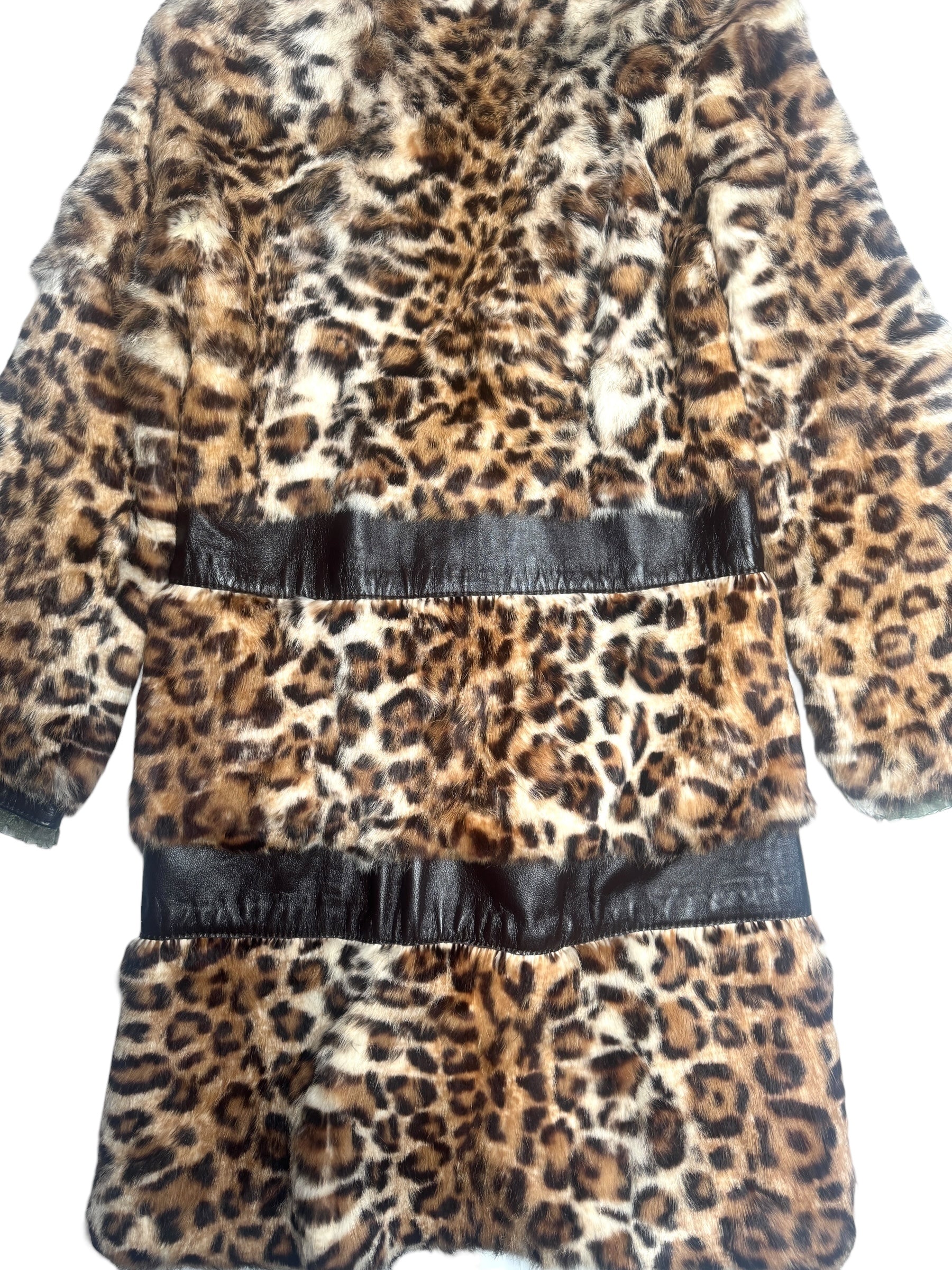 Vintage 90s Animal Leopard Print Genuine Fur Winter Trench Coat with Leather Panel Details | Size S