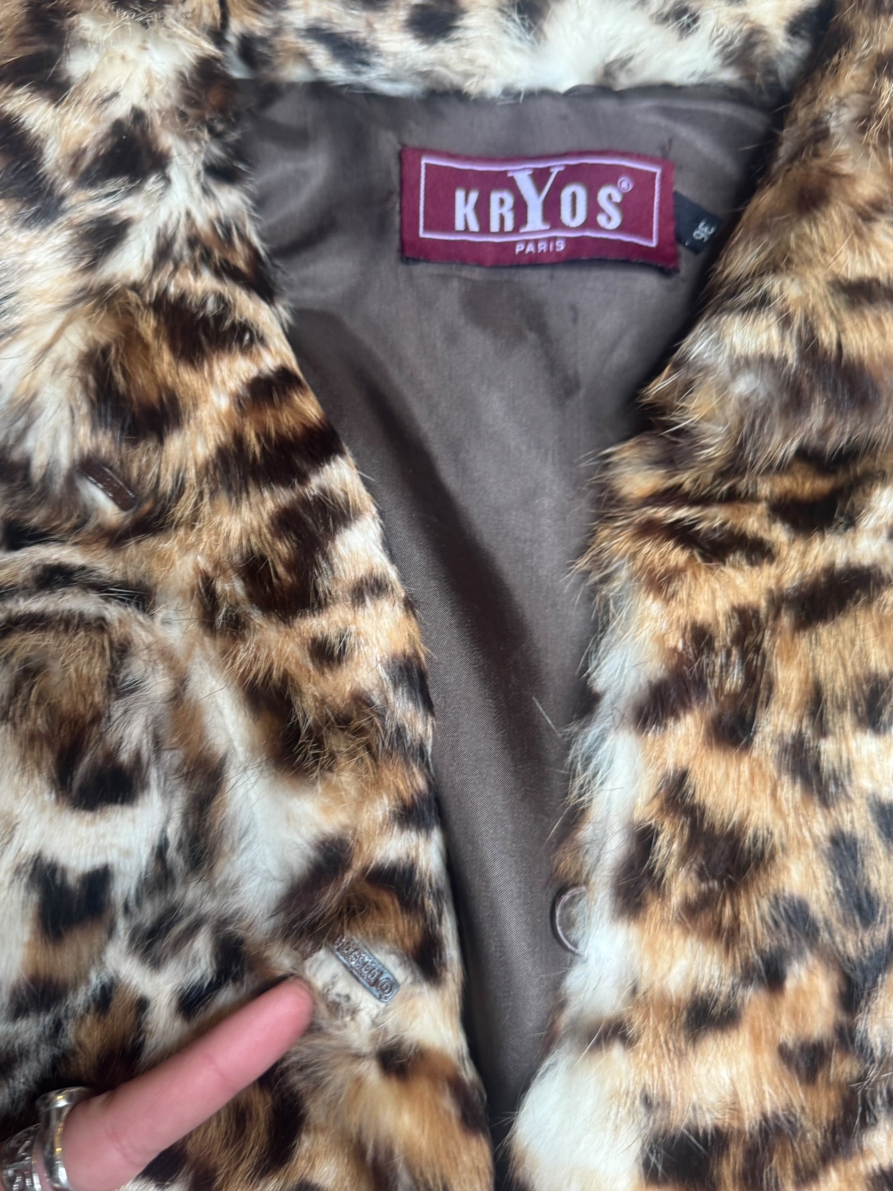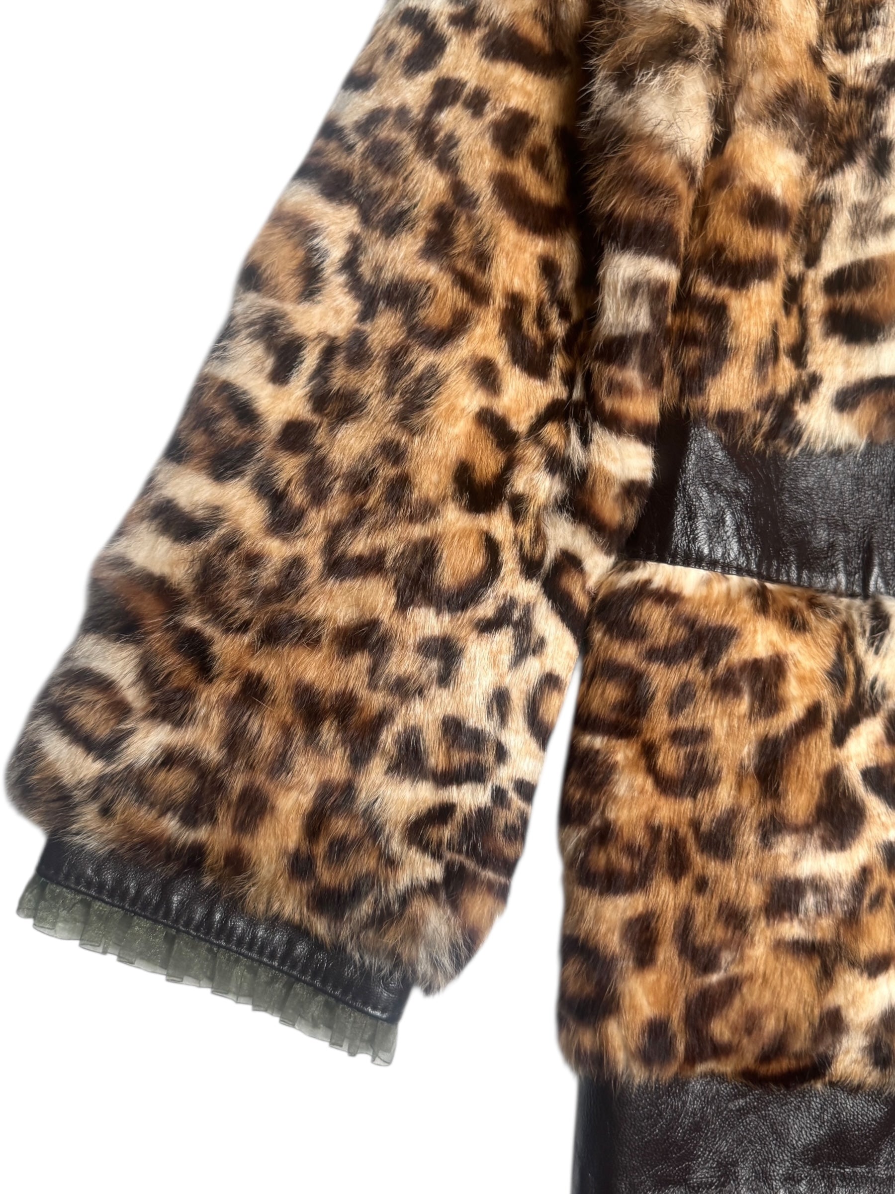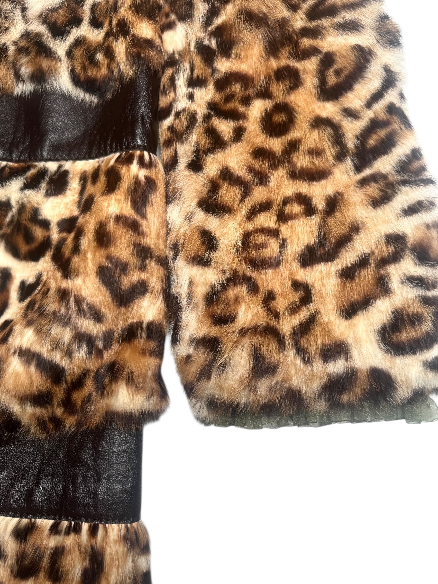 Vintage 90s Animal Leopard Print Genuine Fur Winter Trench Coat with Leather Panel Details | Size S