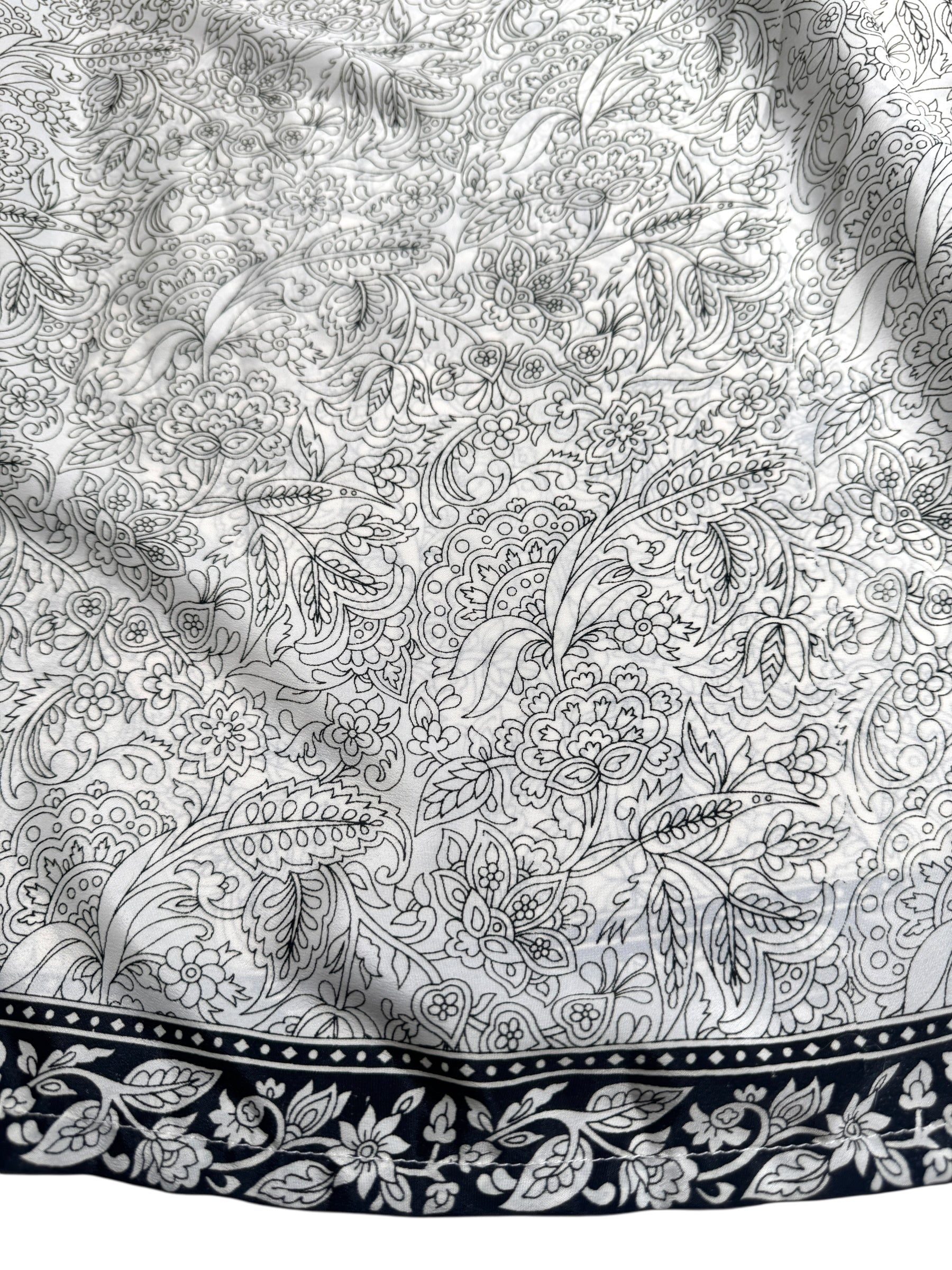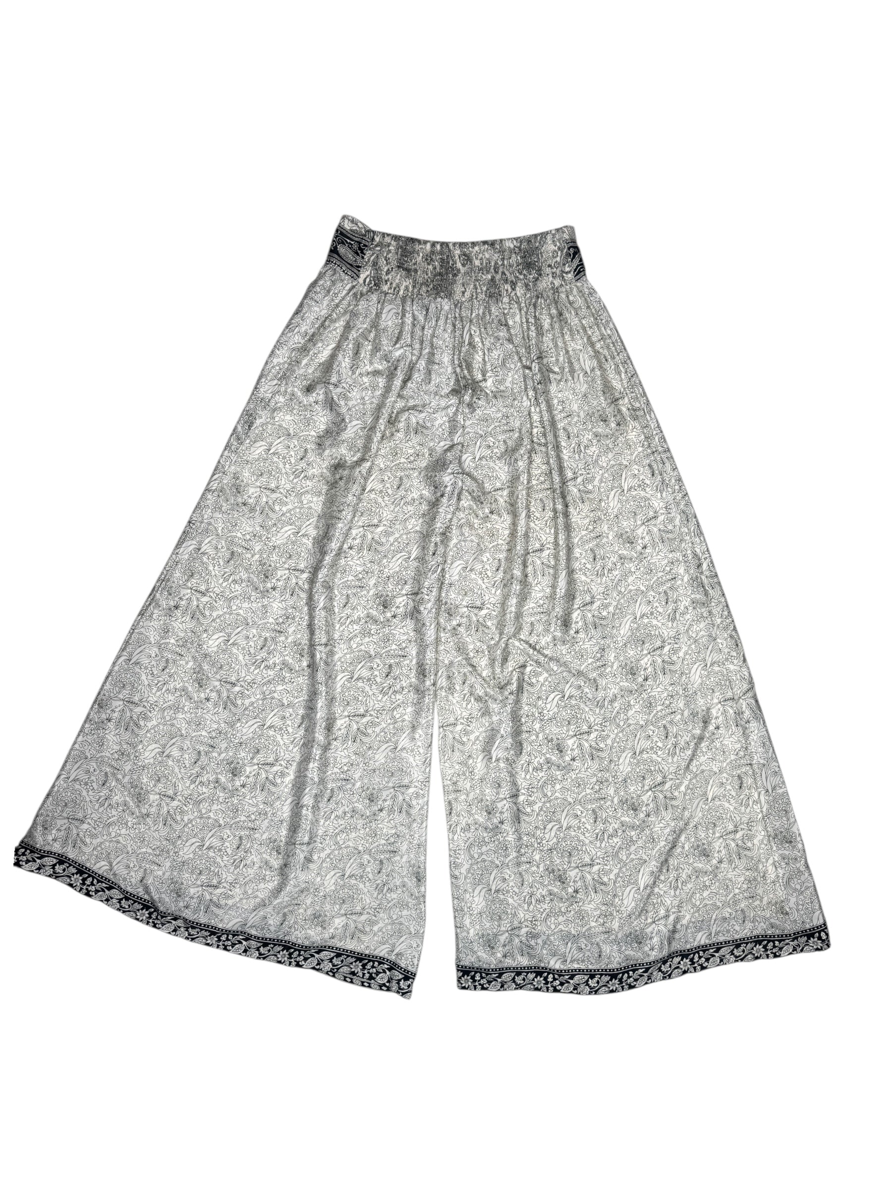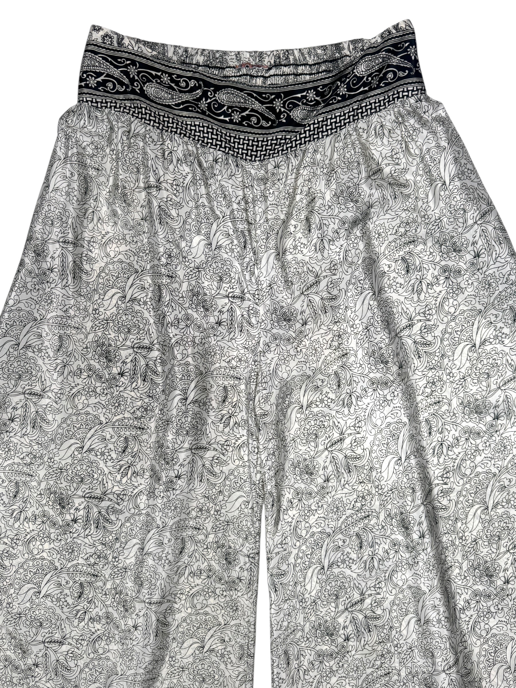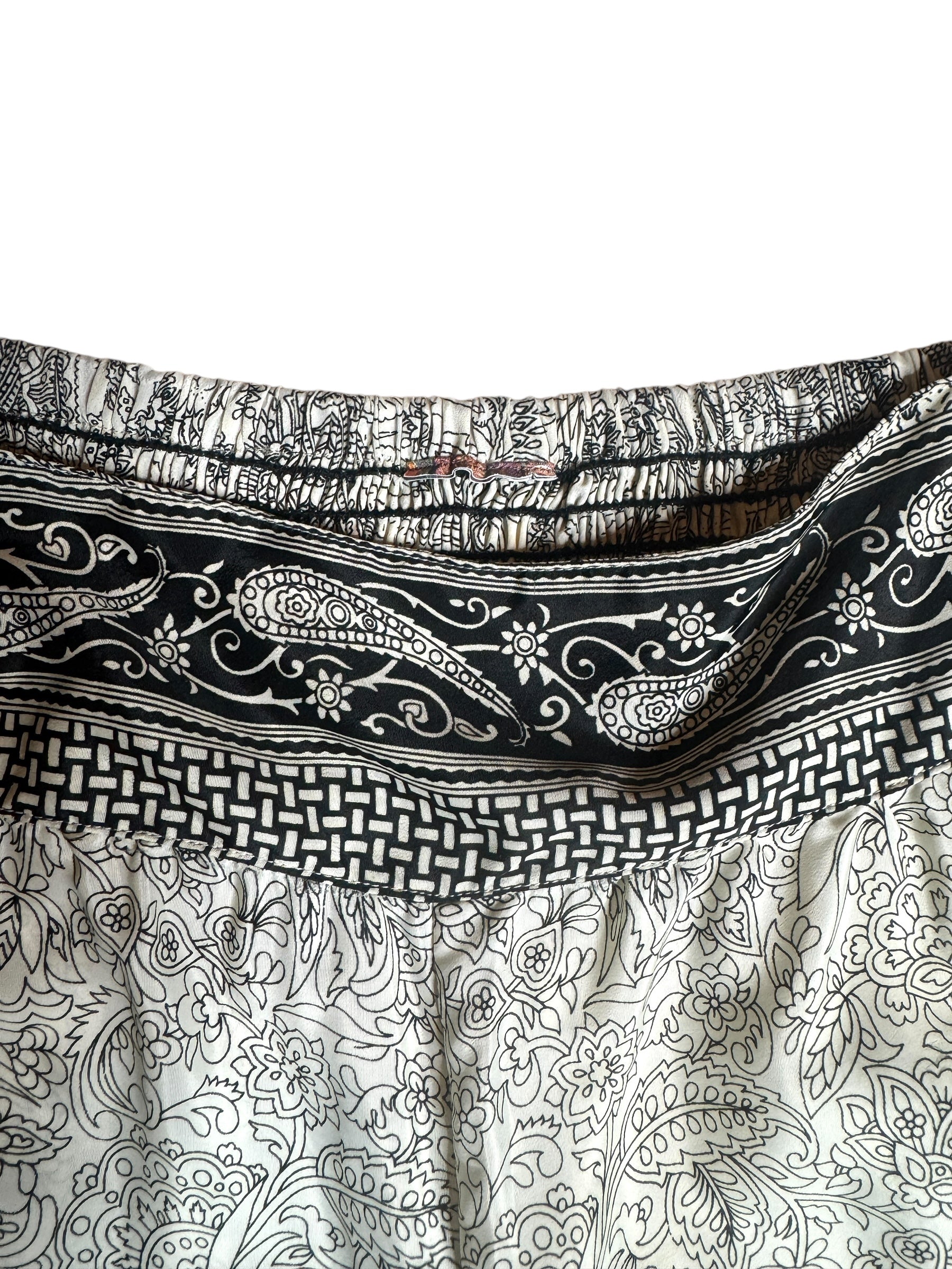 Vintage 2000s Silk Blend High Waisted Cream & Black Abstract Floral Paisley Print Wide Leg Pants | Size M-L