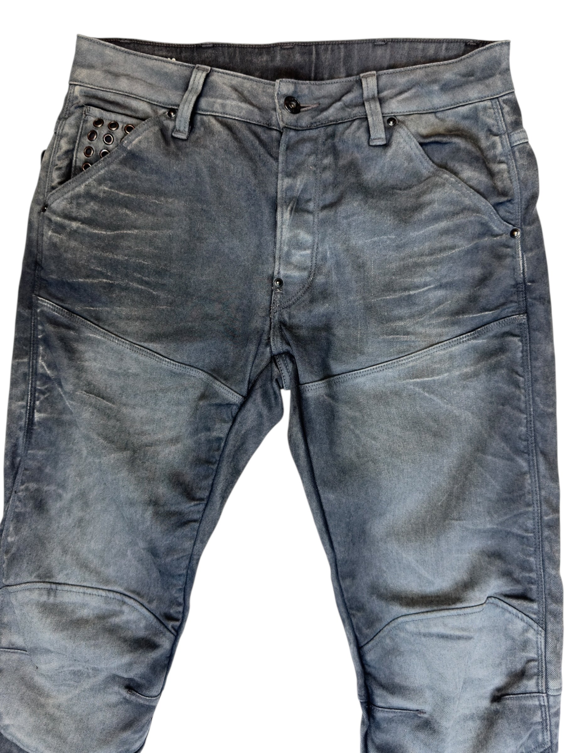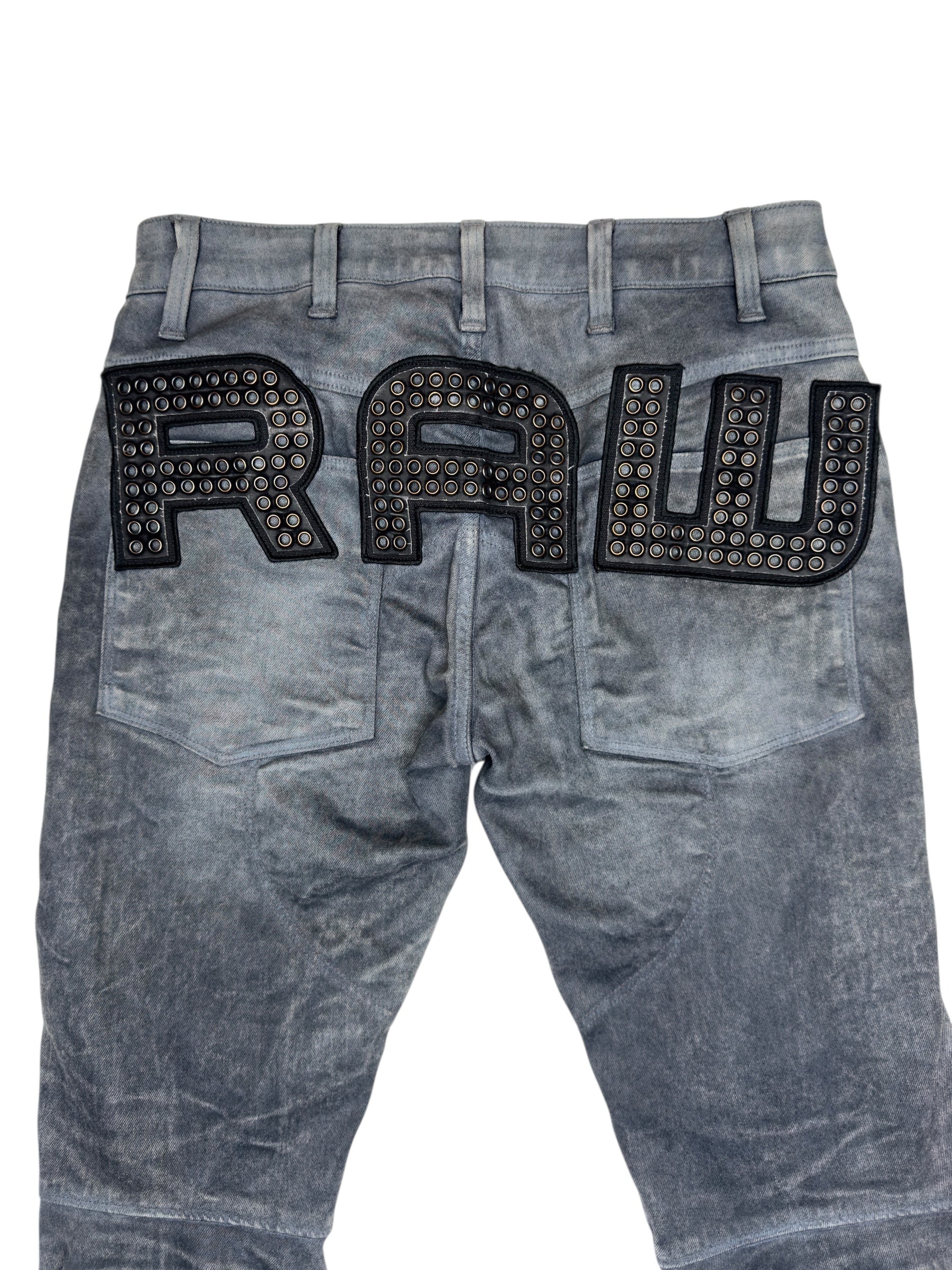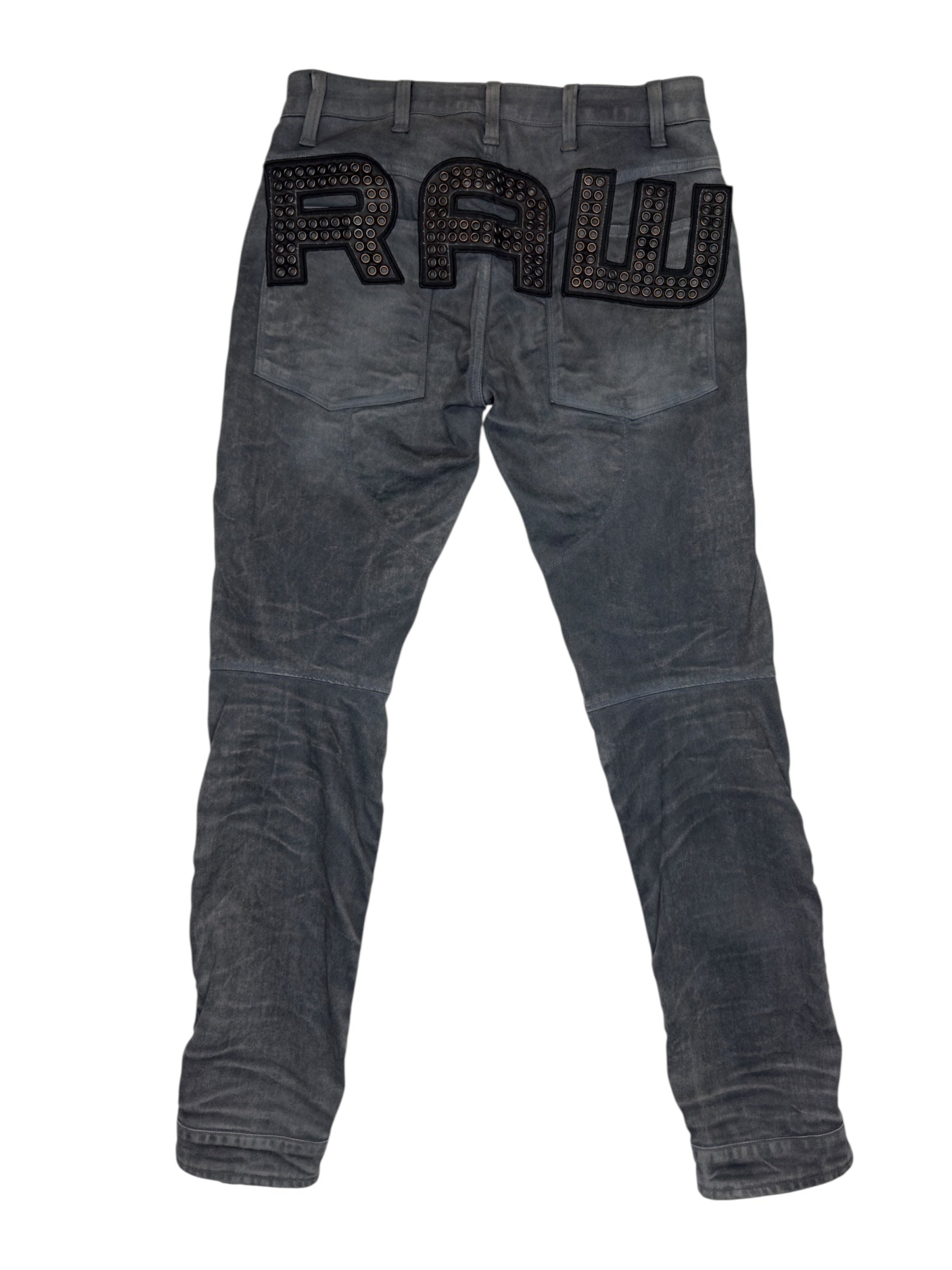 Vintage 2000s Men’s G-Star Raw Moto Patchwork Logo Tapered Grey Denim Slim Fit Jeans with Grommet Detail | 31 Inch Waist