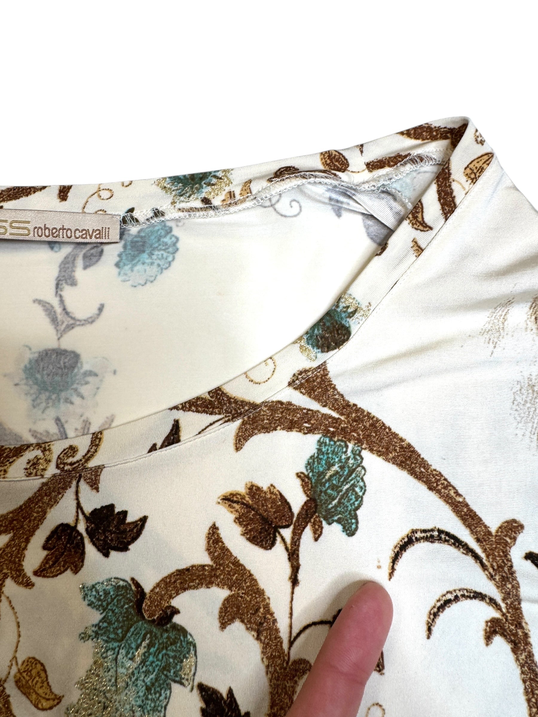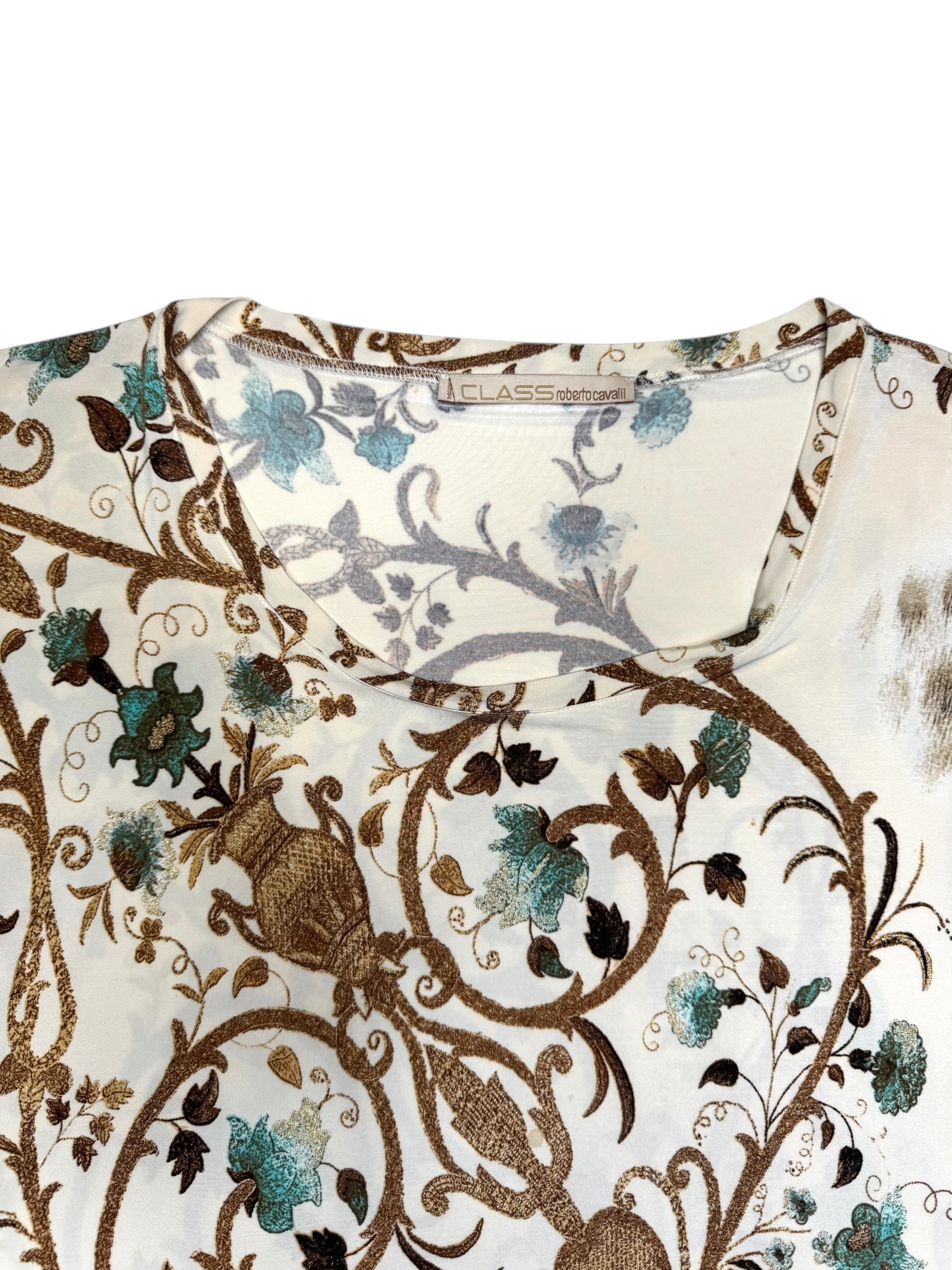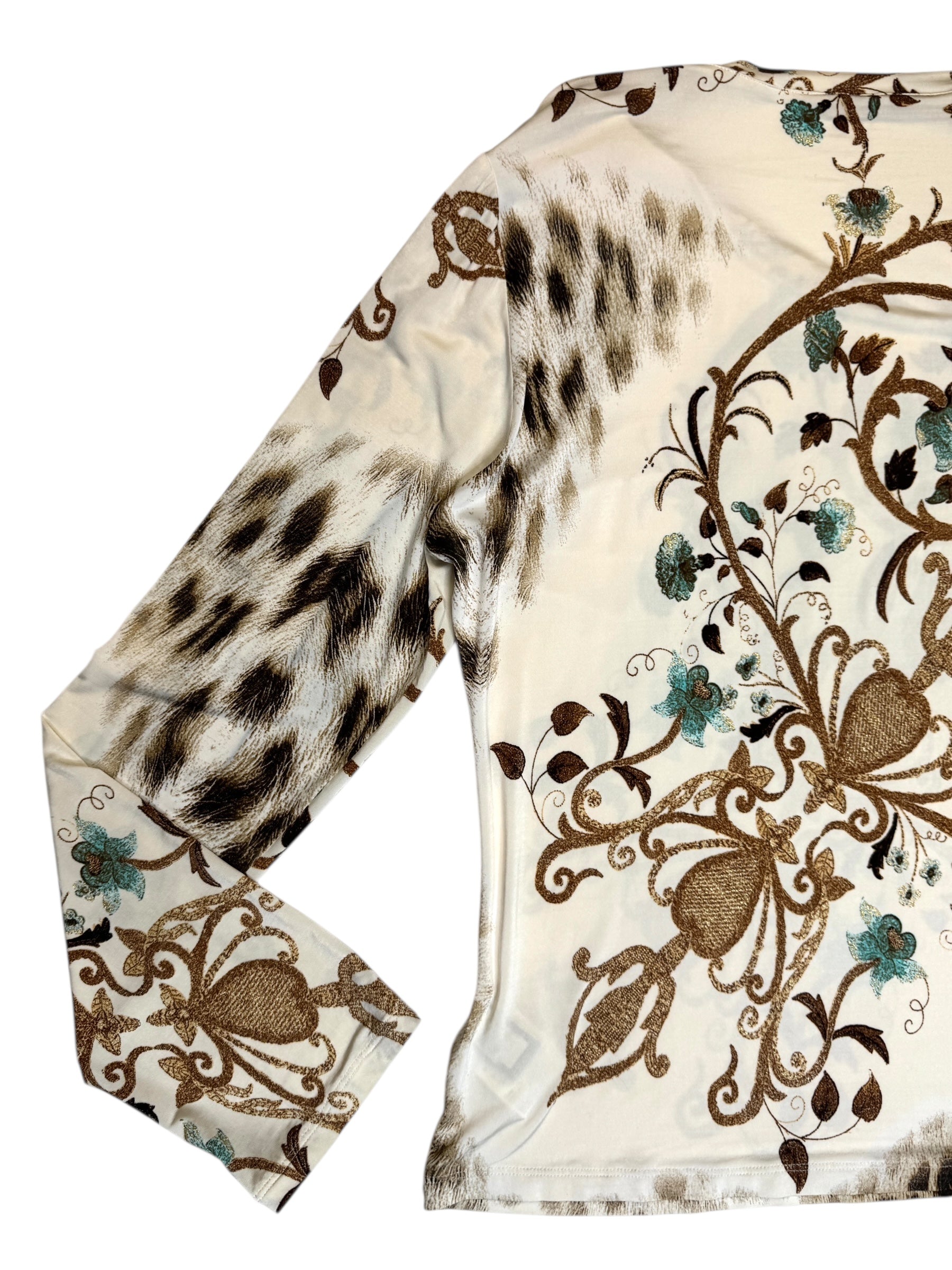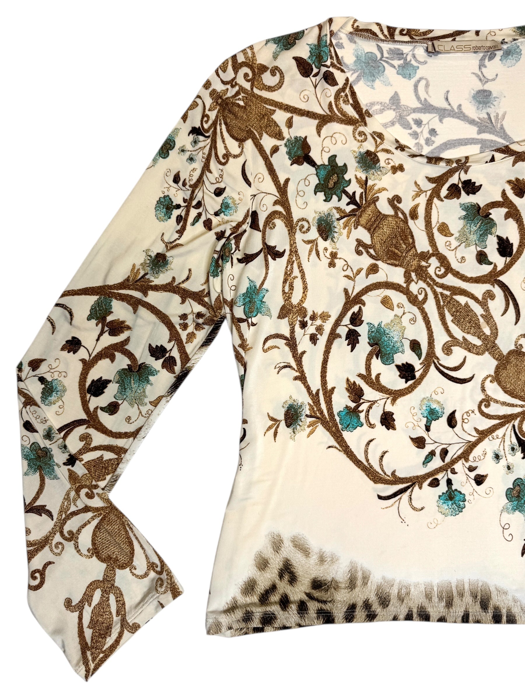 Vintage 2000s Roberto Cavalli Abstract Leopard Fleur-de-Lis Patterned Scoop Neck Long Sleeve Top | Size XL