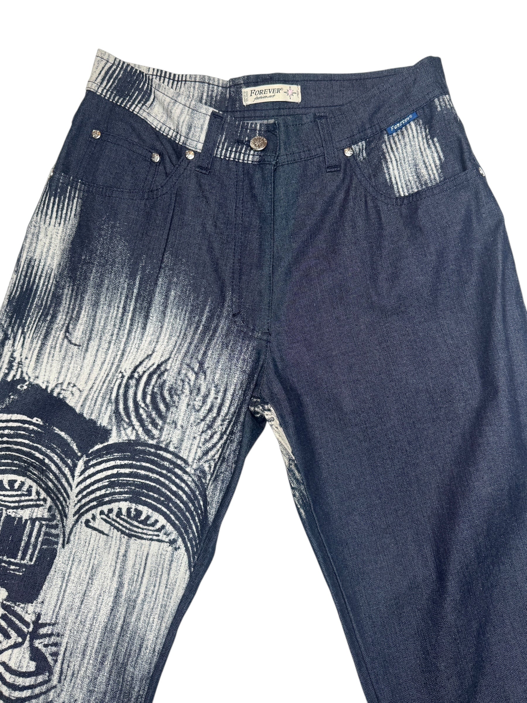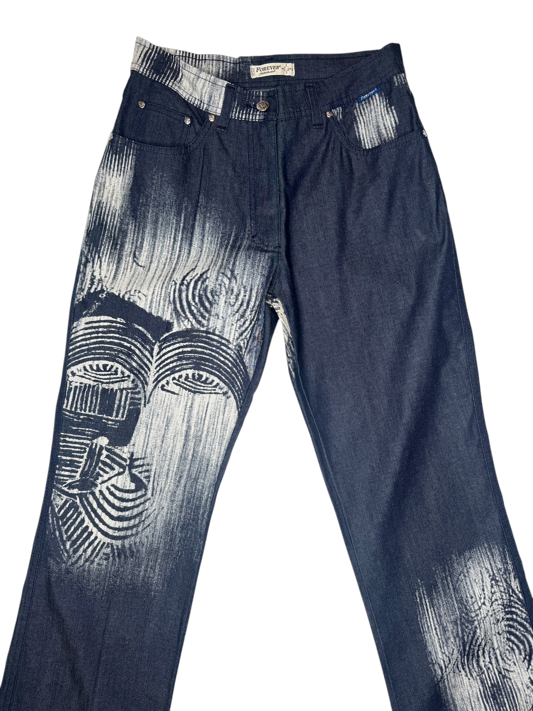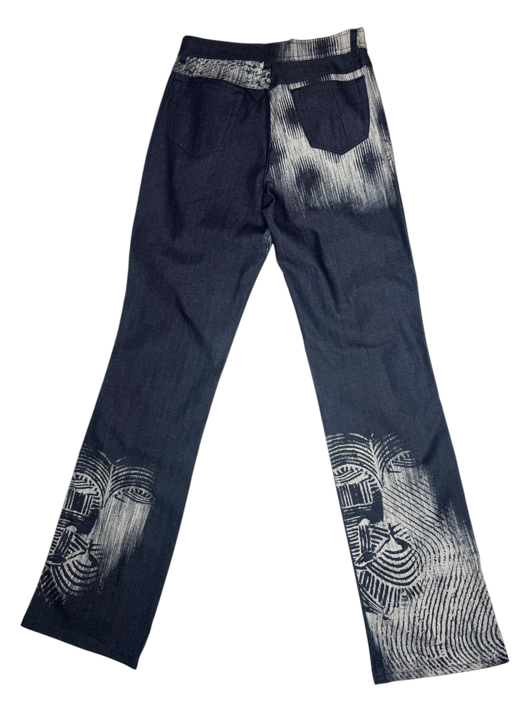 Vintage 2000s High Waisted Abstract Graphic Blue & White Tribal Patterned Straight Leg Jeans | 28 Inch Waist