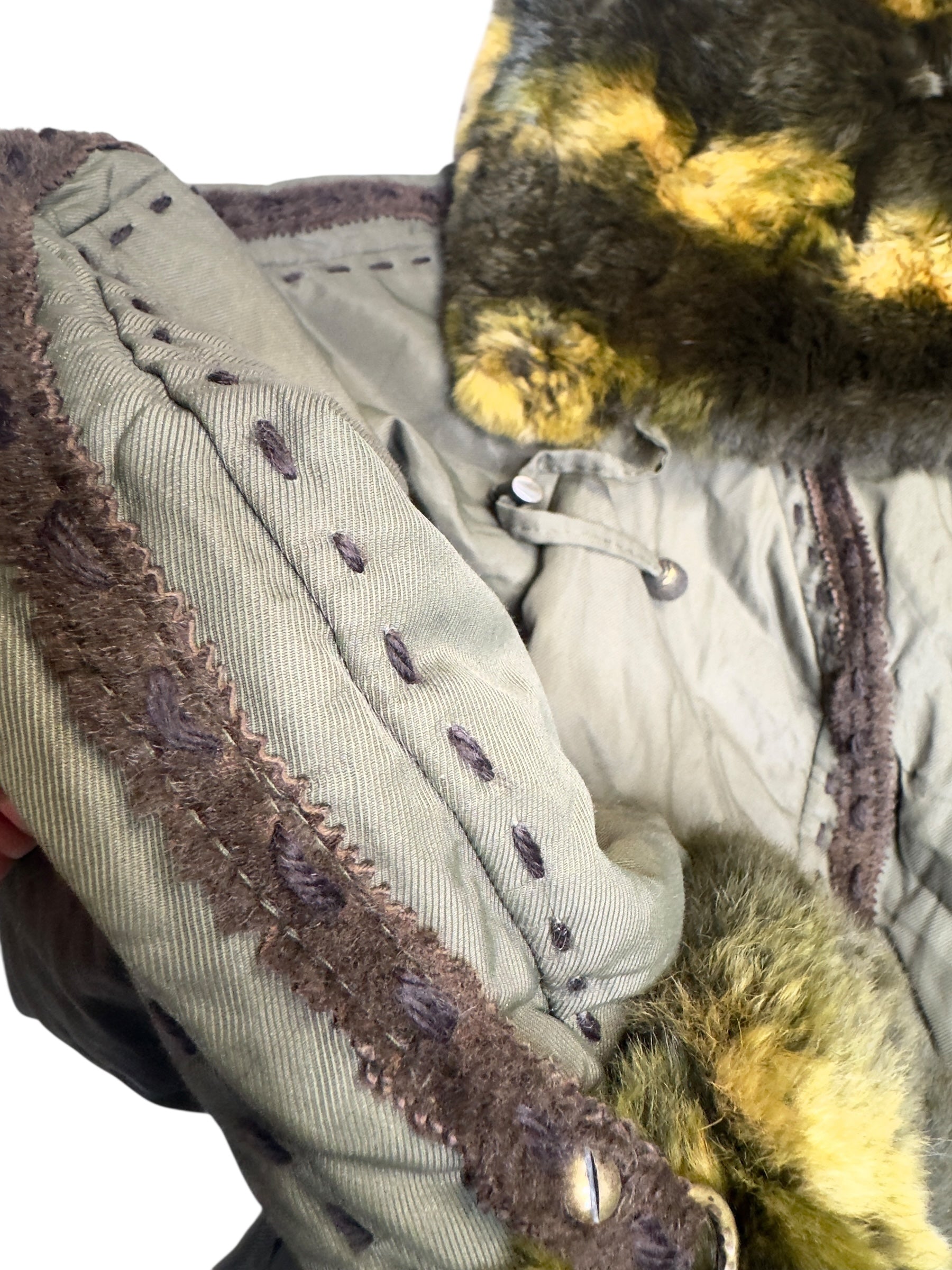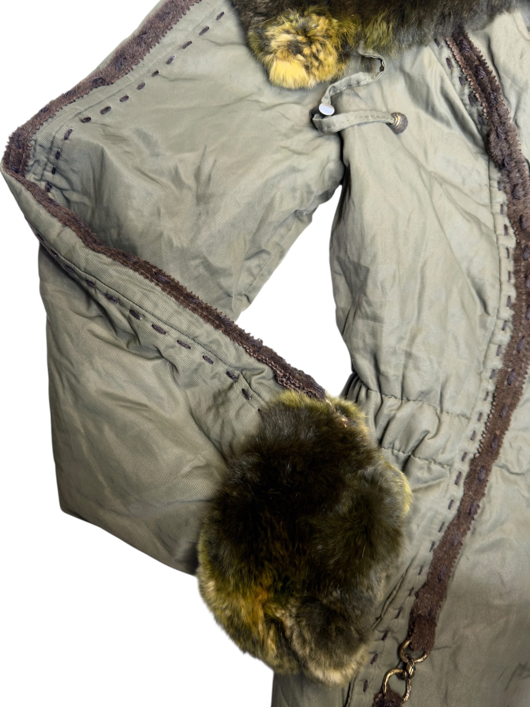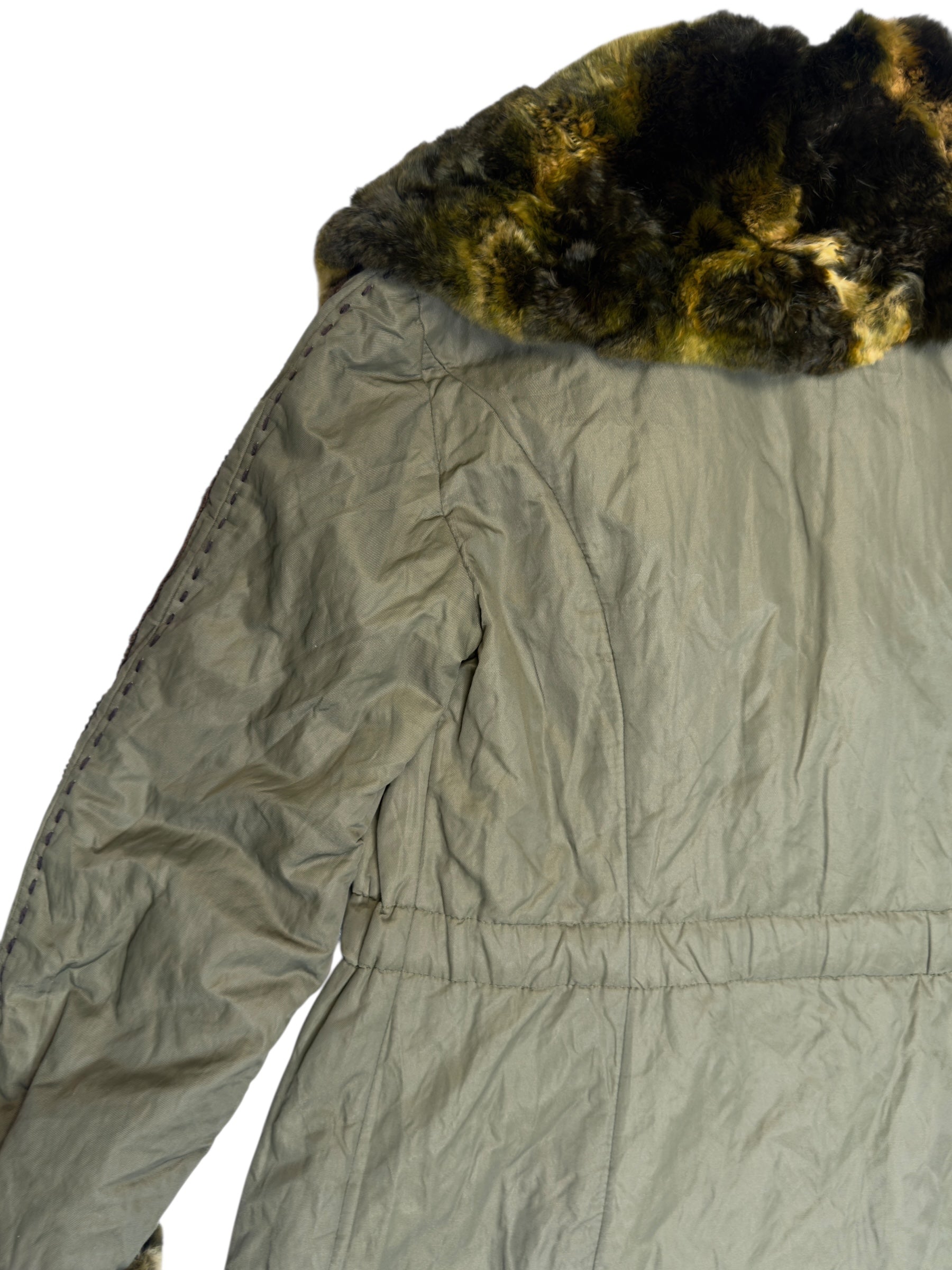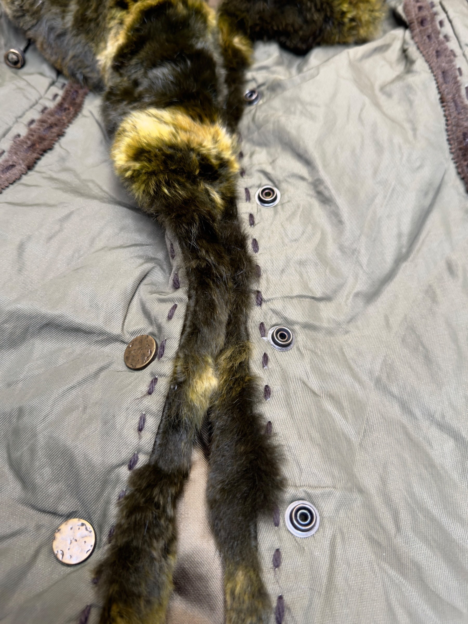 Vintage 2000s Olive Green Faux Fur Trim Snap Button Down Collared Jacket with Elasticated Waist Leather Trim & Embroidered Stitch Detail | Size L