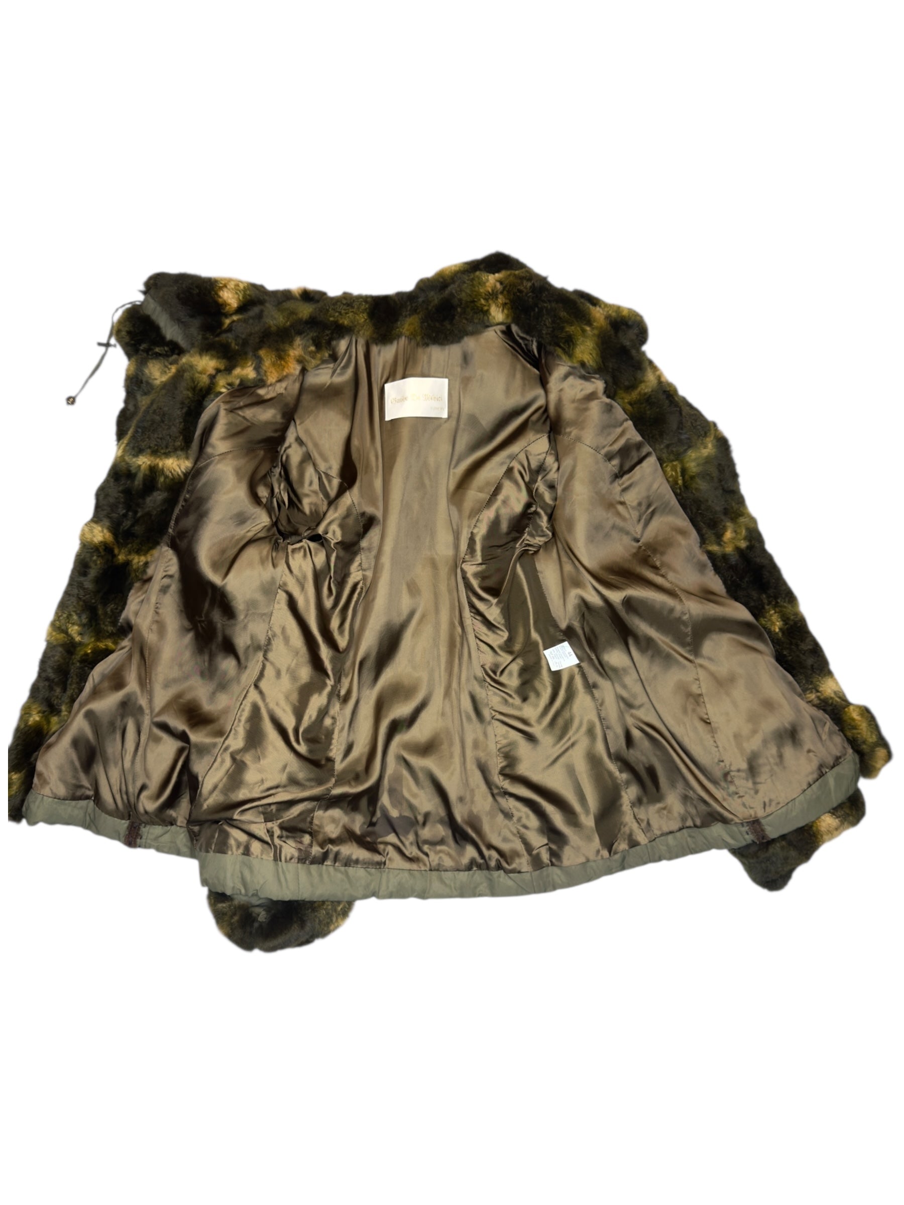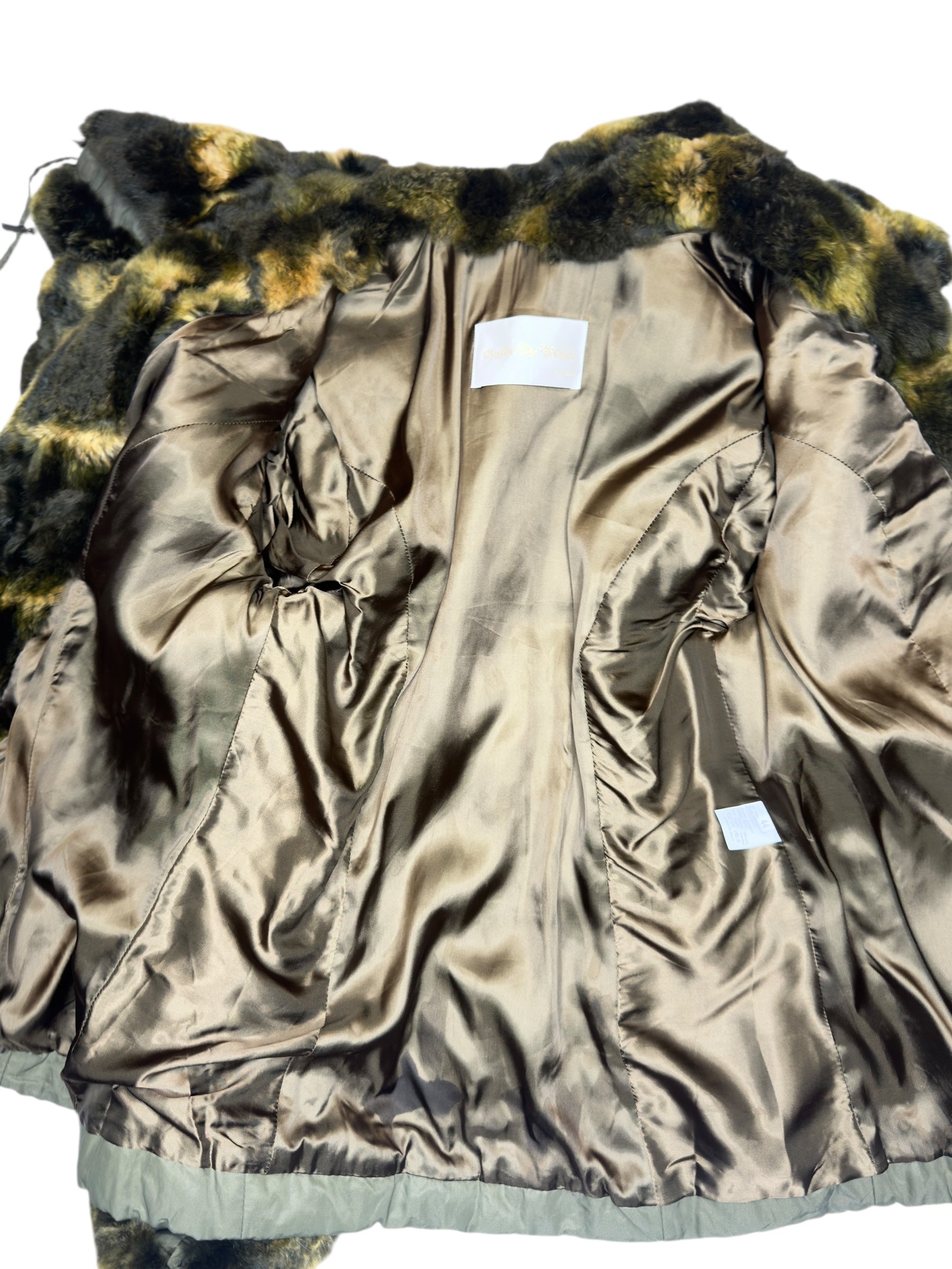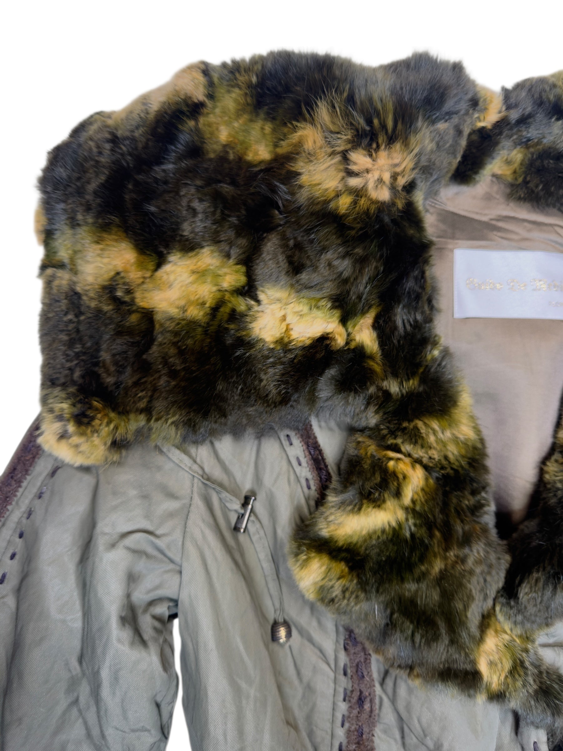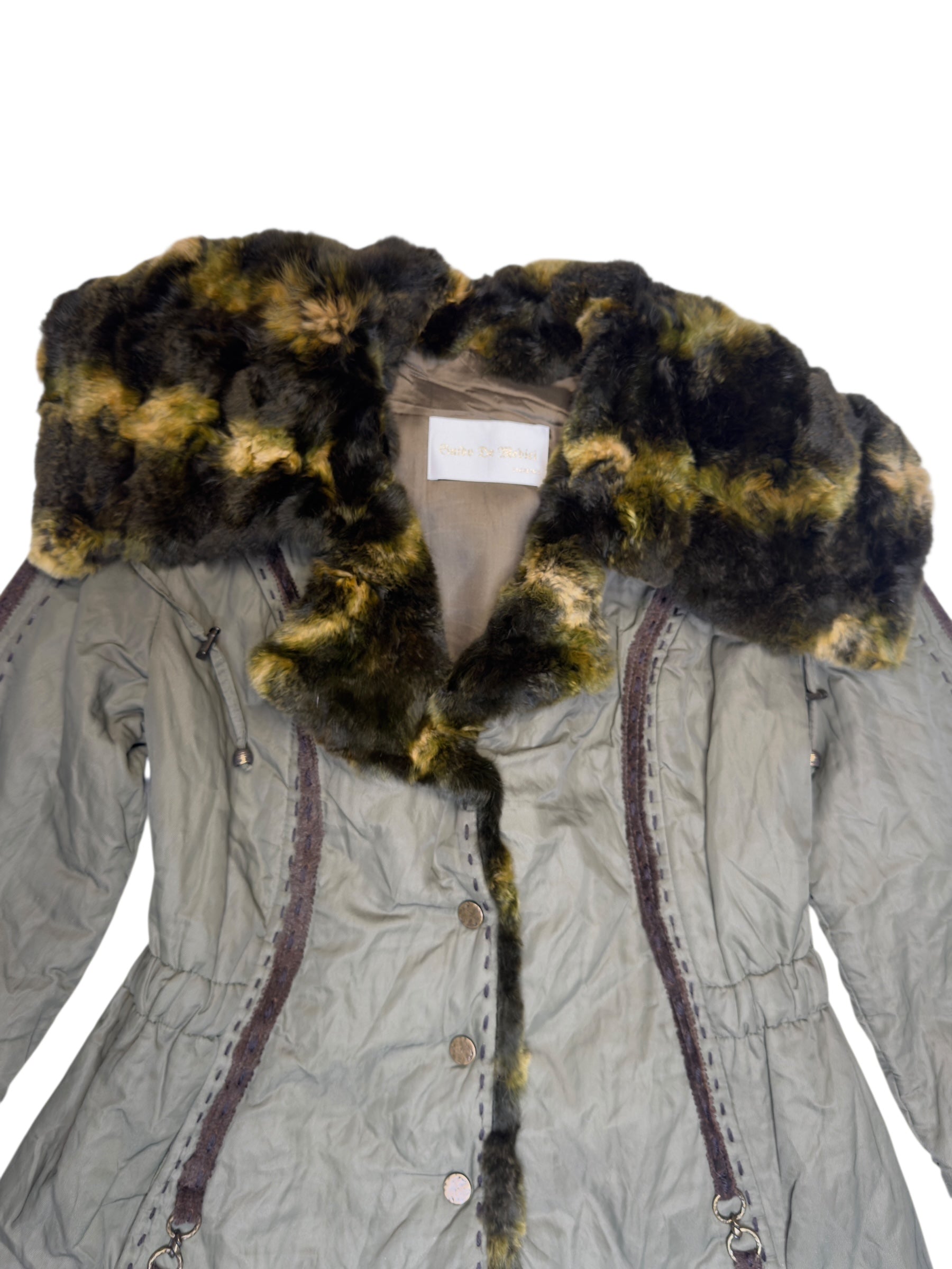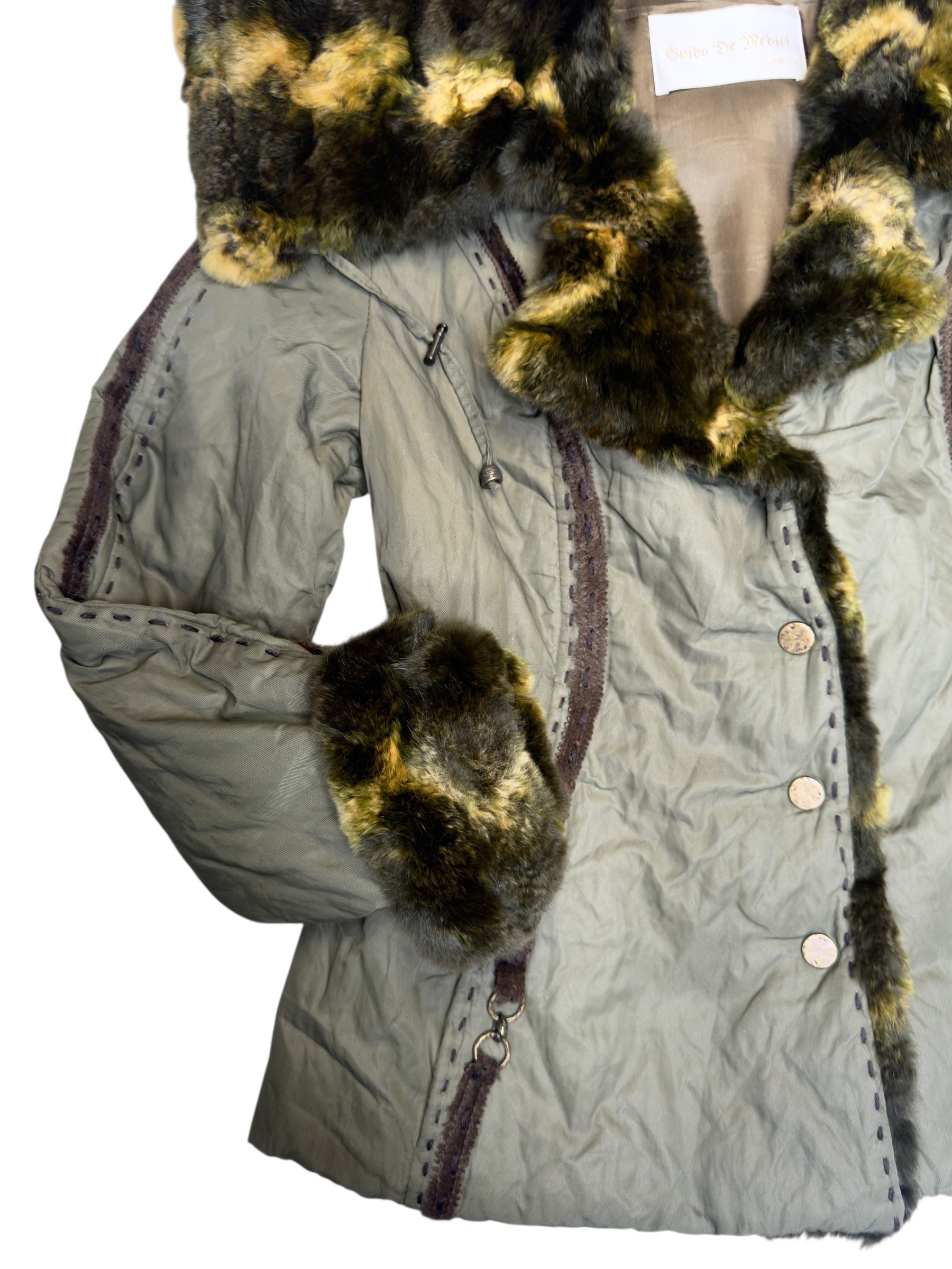 Vintage 2000s Olive Green Faux Fur Trim Snap Button Down Collared Jacket with Elasticated Waist Leather Trim & Embroidered Stitch Detail | Size L