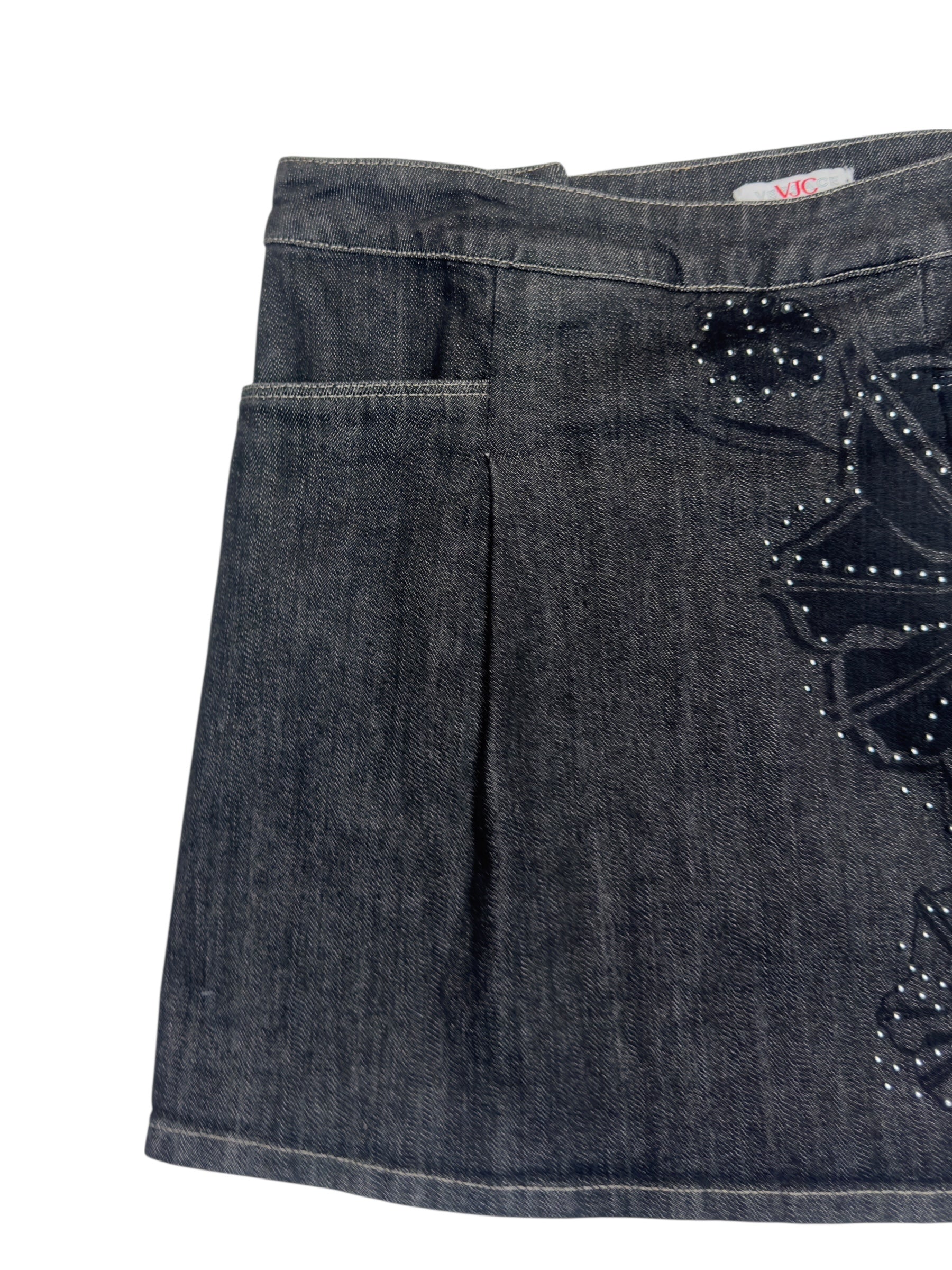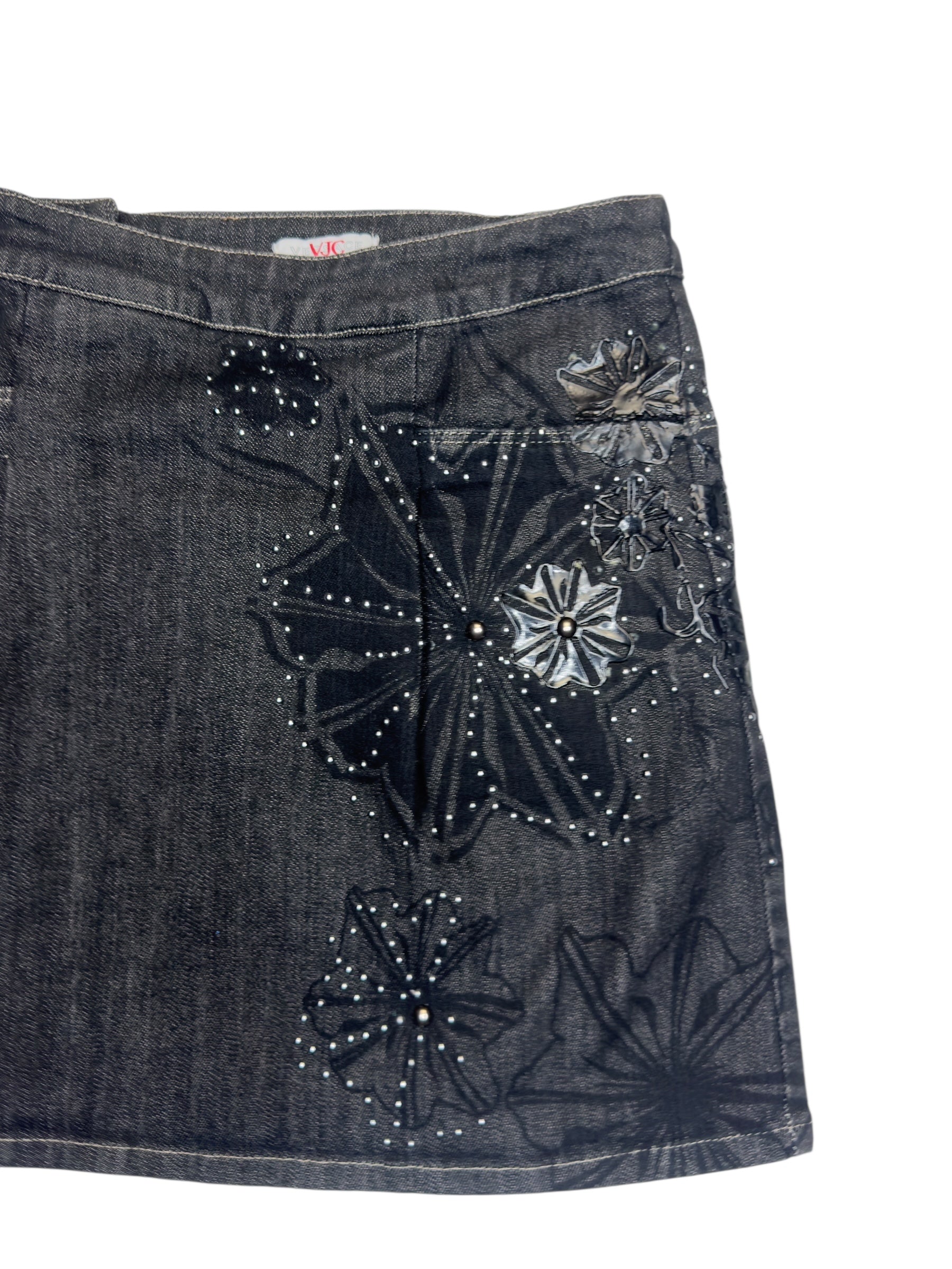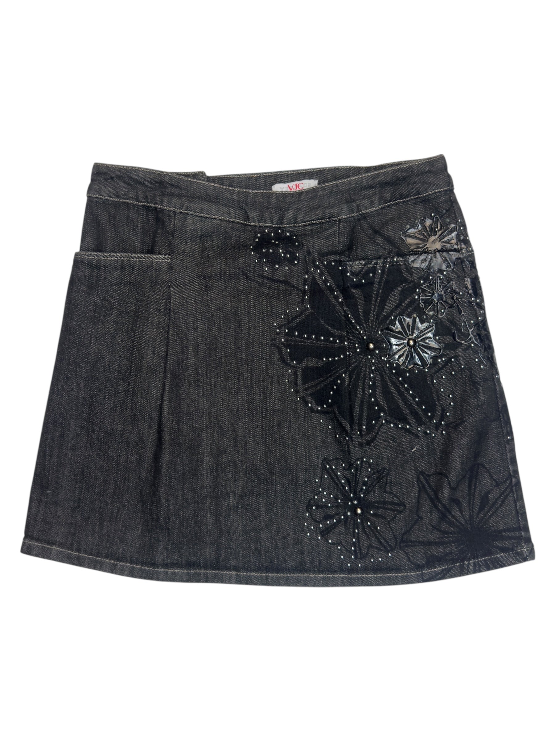 Vintage 2000s Versace Jeans Couture Black Denim Mid Rise A-Line Mini Skirt with Floral Appliqué Detail | 29 Inch Waist