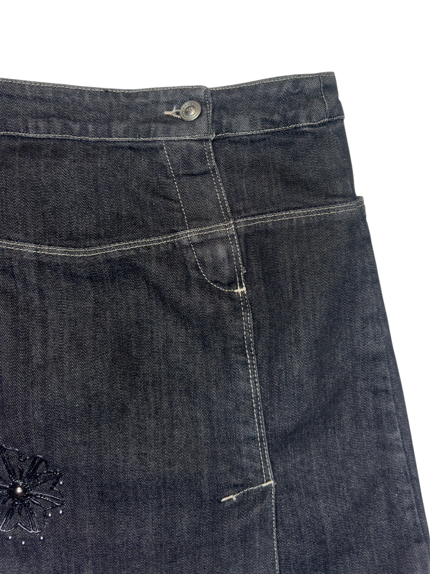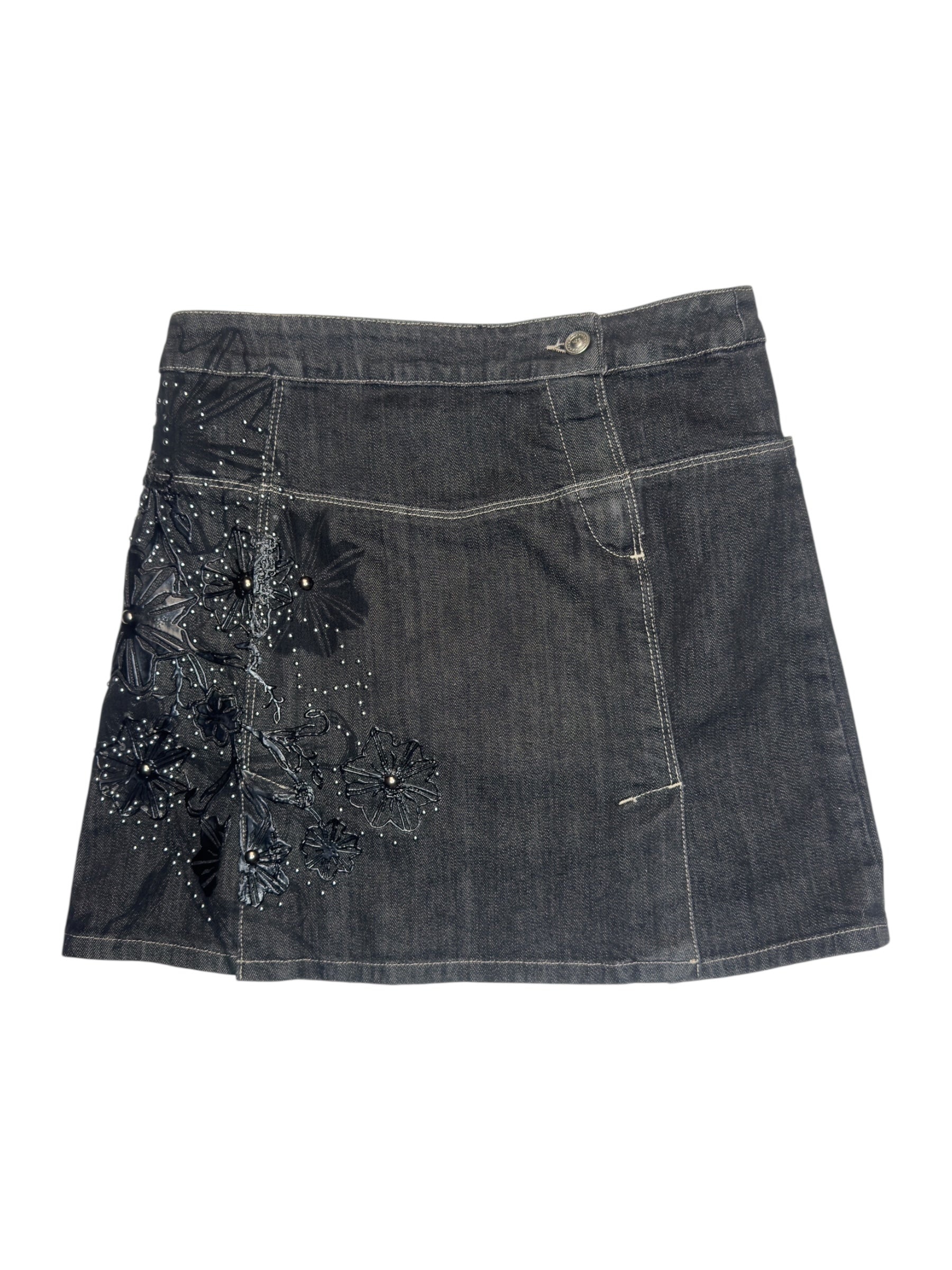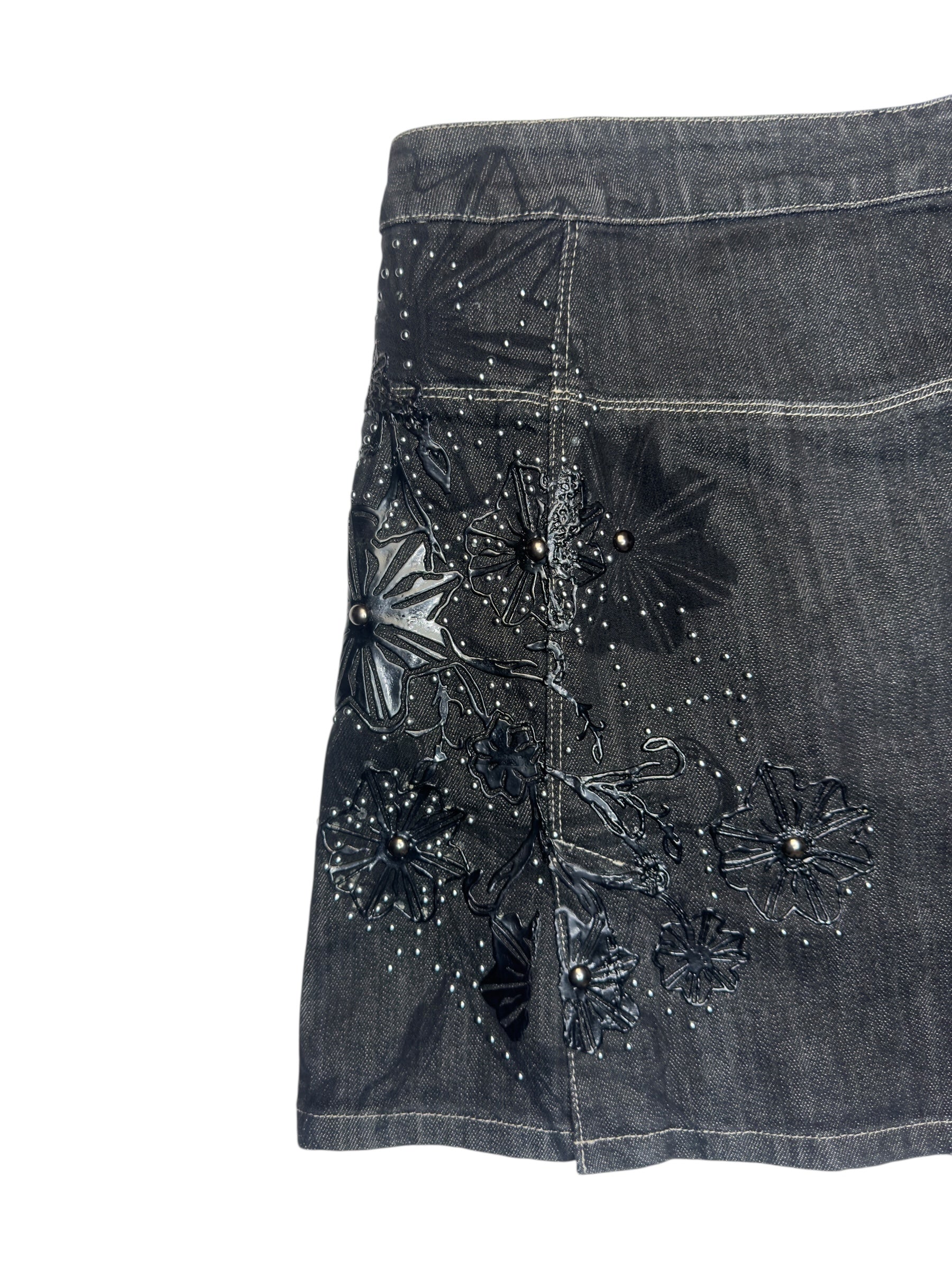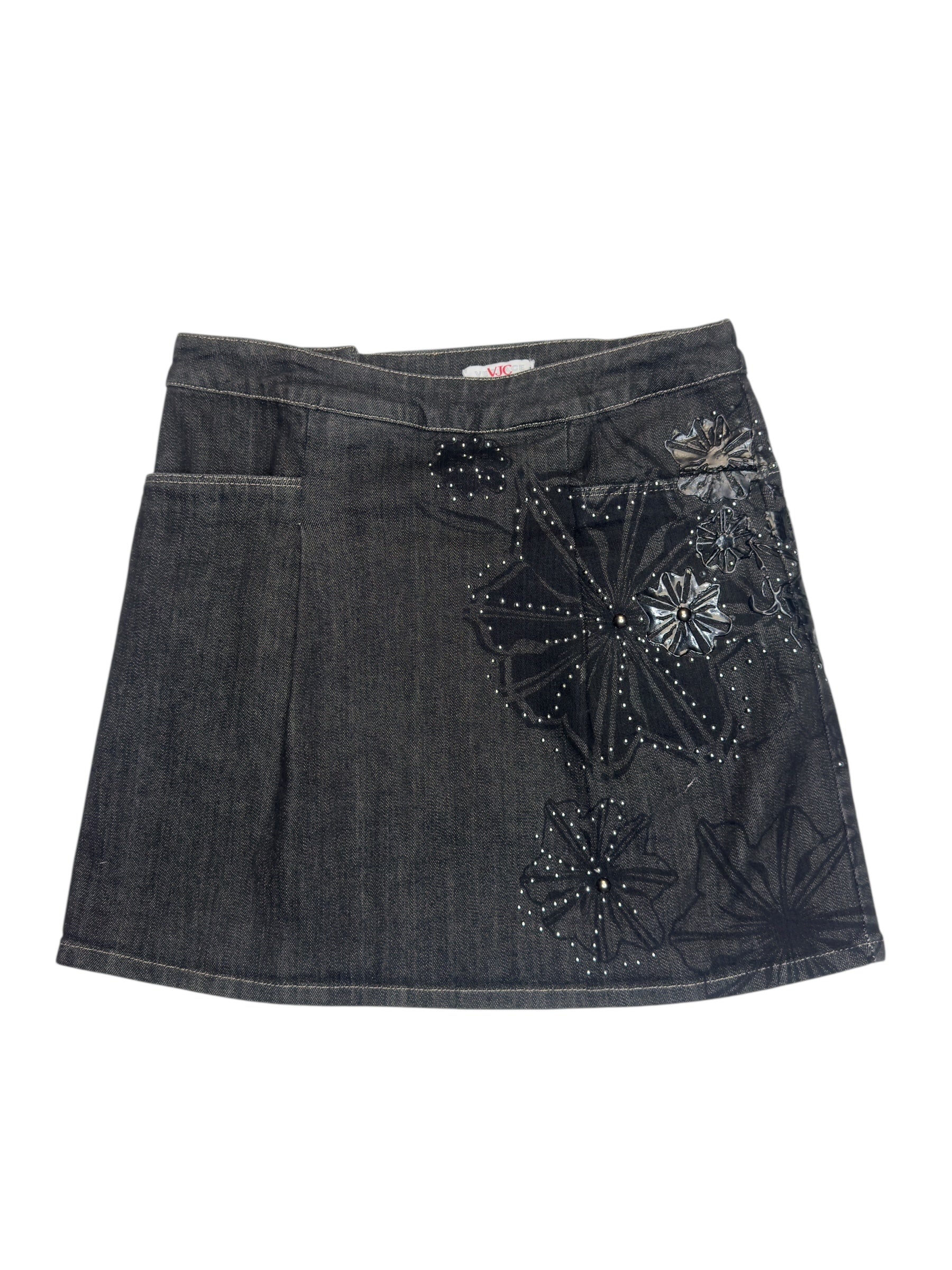 Vintage 2000s Versace Jeans Couture Black Denim Mid Rise A-Line Mini Skirt with Floral Appliqué Detail | 29 Inch Waist